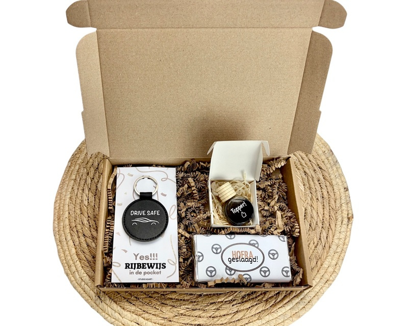 Dit cadeaupakket past door de brievenbus en bevat drie leuke items. Een stoere sleutelhanger met de tekst ‘Drive safe’, perfect voor de nieuwe autosleutel. Daarnaast zit er een heerlijk ruikende autogeurhanger in een glazen flesje met de tekst ‘Topper!’, verpakt in een klein doosje. Als extra zit er ook een chocoladereepje (40 g) met de tekst ‘Hoera geslaagd!’ bij.