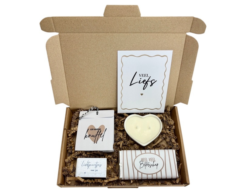 Dit brievenbus beterschap cadeau bevat fijne items voor een rustmomentje. Even een kopje thee, een stukje chocolade en een kaarsje aan — precies wat iemand kan gebruiken tijdens het herstel. Door de zachte en neutrale uitstraling is dit cadeau geschikt voor iedereen.