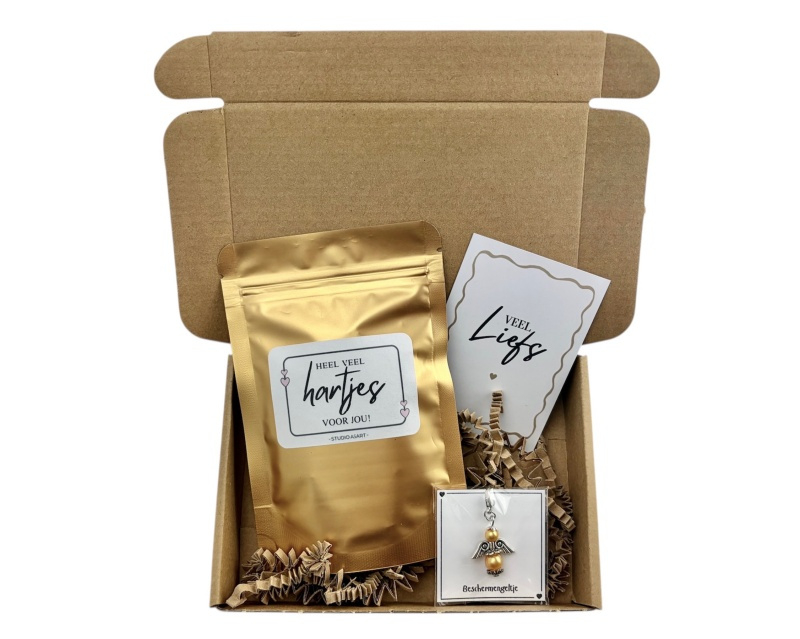 In dit kleine cadeau vind je een fijne combinatie van iets lekkers en een klein aandenken. De snoephartjes zorgen voor een zoet momentje, en de beschermengel kan iemand bij zich dragen voor net dat beetje extra steun en troost.