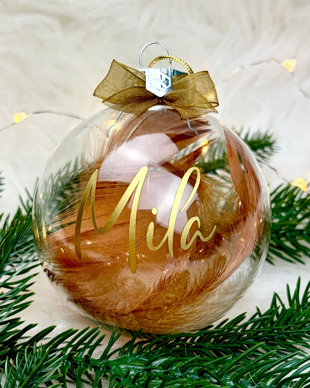 Artikelnummer: 8KBN10Maak de feestdagen extra bijzonder met deze elegante, transparante kerstbal die je kunt personaliseren met een naam naar keuze. Deze doorzichtige, glazen kerstbal, met een diameter van 8 cm, is gevuld met sierlijke veren en is het perfecte cadeau voor dierbaren of een verfijnde toevoeging aan je eigen kerstboom.