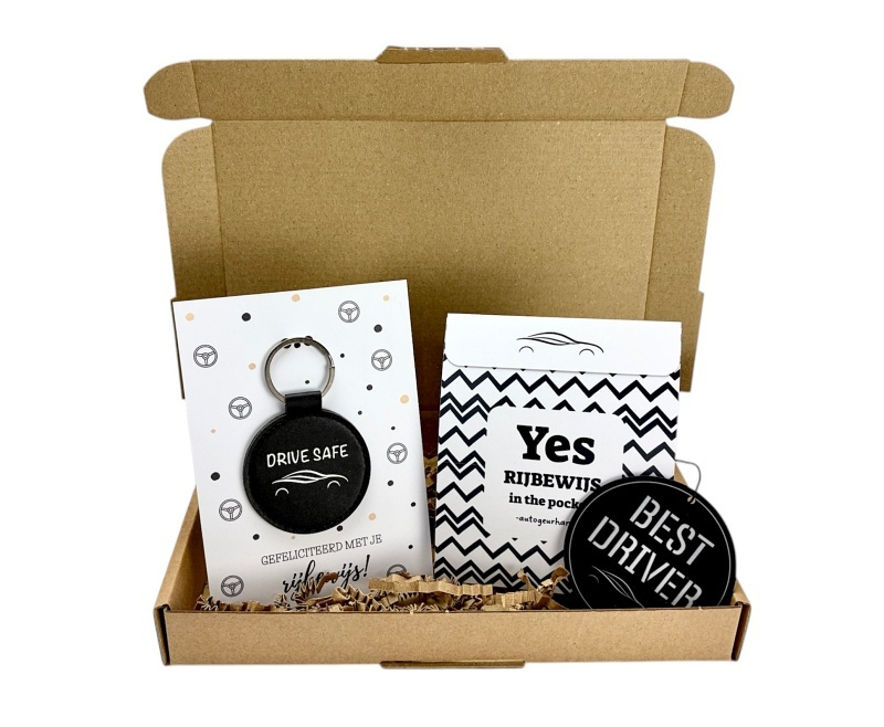 - Een autogeurhanger “Best Driver” in een doosje met de tekst “Yes, rijbewijs in the pocket”